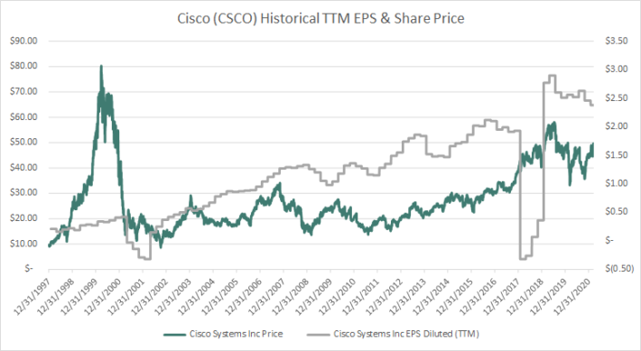 Cisco as a business has done well and increased shareholder value on a per share basis over time. However, the stock was swept up in the tech bubble of ~20 years ago. And the company’s stock still has not reached its previous highs, despite strong earnings-per-share growth.Source: Data from Ycharts.