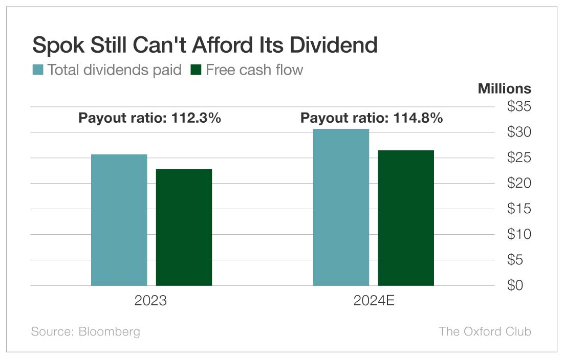 That's why Wall Street's $30.4 million estimate for Spok's total dividend payout in 2024 doesn't make sense to me. Analysts are clearly expecting Spok to boost the dividend this year… but if the CEO himself acknowledges that the company isn't generating enough cash to afford its current dividend, why would it raise the dividend even further? That would be very irresponsible.