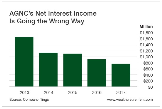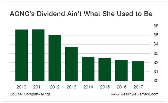 Last year, AGNC paid out $795 million in dividends. That’s $16 million more than it took in. So it couldn’t afford the dividend it paid last year.