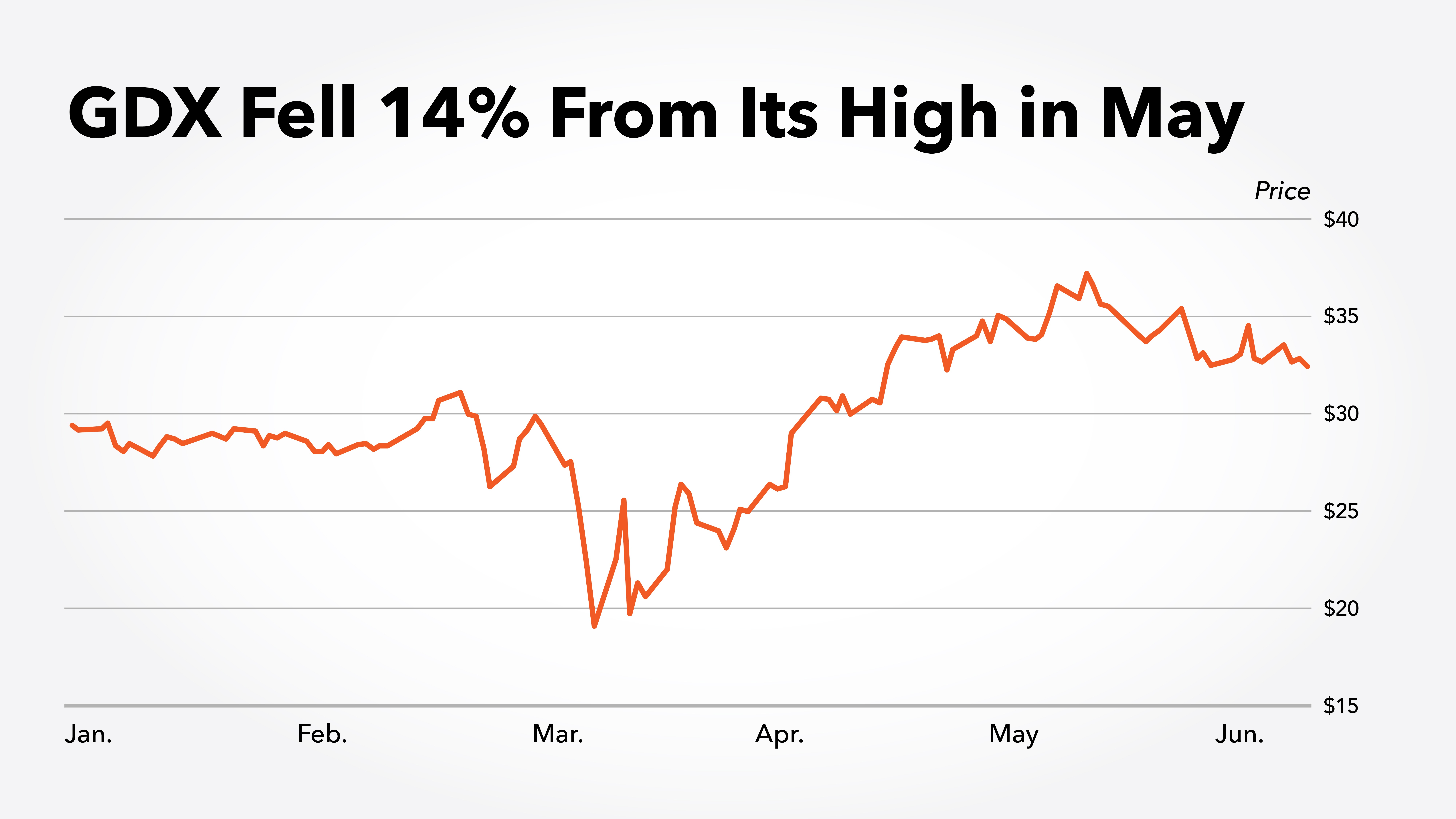 Gold miners have eased off their recent highs. You can see what I mean from this chart of the VanEck Vectors Gold Miners ETF (NYSE: GDX):
