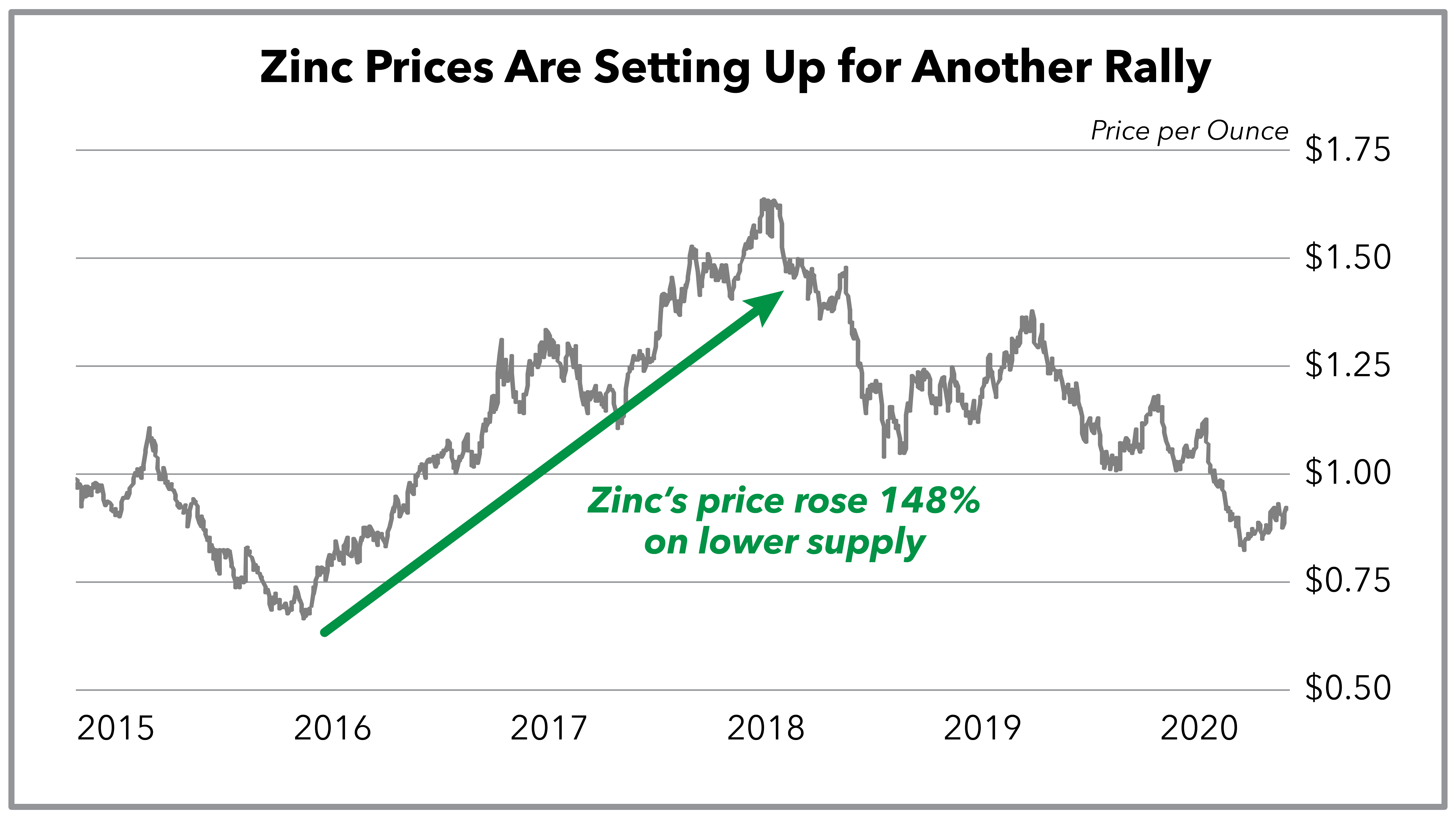 After hitting a bottom in 2016, zinc prices soared over 140% in two years. Analysts don’t expect a repeat of the 2015 market. However, I think we’re going to see a faster, steeper recovery. Demand can return faster than miners can ramp back up. And there are some headwinds for the reopening mines.